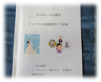 こんにちは。 関西作法会 Yです。 先日開催しました「心のおしゃれ講座」のご報告です。 日時 令和元年11月30日(日) 午後1時30分~3時 会場 トータルマナー株式会社 講師 トータルマナー株式会社 佐藤 恵子 内容 イマドキの冠婚葬祭ウラ情報! 講座を担当した佐藤講師よりの感想です。 心のおしゃれ講座「イマドキ…